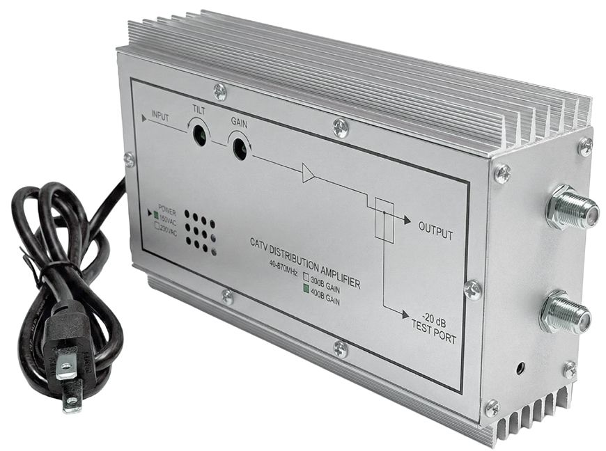 This professional-grade coax CATV distribution amplifier helps boost the analog/digital cable TV, CCTV, SMATV or all other modulated TV system with 40 dB gain.